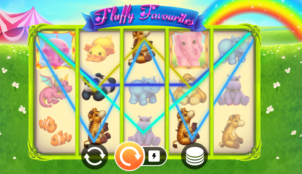 The Fluffy Favourites grid never shifts. Reels stay left to right, rows stay top to bottom — once learned, the player follows motion, not structure.